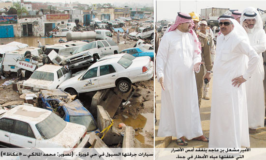 تفقد صاحب السمو الملكي الأمير مشعل بن ماجد محافظ جدة أمس، أحياء قويزة، العدل، الروابي، أم الخير، وكوبري الخير التي تضررت من السيول التي شهدتها جدة أمس. واطلع محافظ جدة على الأضرار التي خلفتها السيول والأمطار ووجه بتأمين كل الاحتياجات للمواطنين والمقيمين المتضررين من إيوائهم وتوفير الإعاشة وكل ما يلزمهم. ووقف الأمير مشعل بن ماجد ميدانيا على أعمال معالجة أضرار السيول التي ضربت حي قويزة والأحياء المتضررة الأخرى، وجال في الأحياء المنكوبة ووجه بسرعة إزالة الأضرار وفتح الطرق، ورافقه في الجولة وزير النقل جبارة الصريصري، المهندس مفرح الزهراني مدير عام إدارة النقل والطرق في منطقة مكة المكرمة، مدير شرطة جدة اللواء علي الغامدي، واللواء محمد الغامدي مدير الدفاع المدني في جدة.